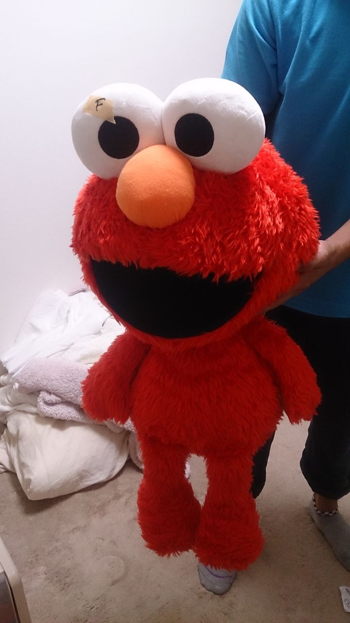 「あ、、ふ、船便で、、」と言ったら「F」を貼られた我が家最大のエルモ(笑)